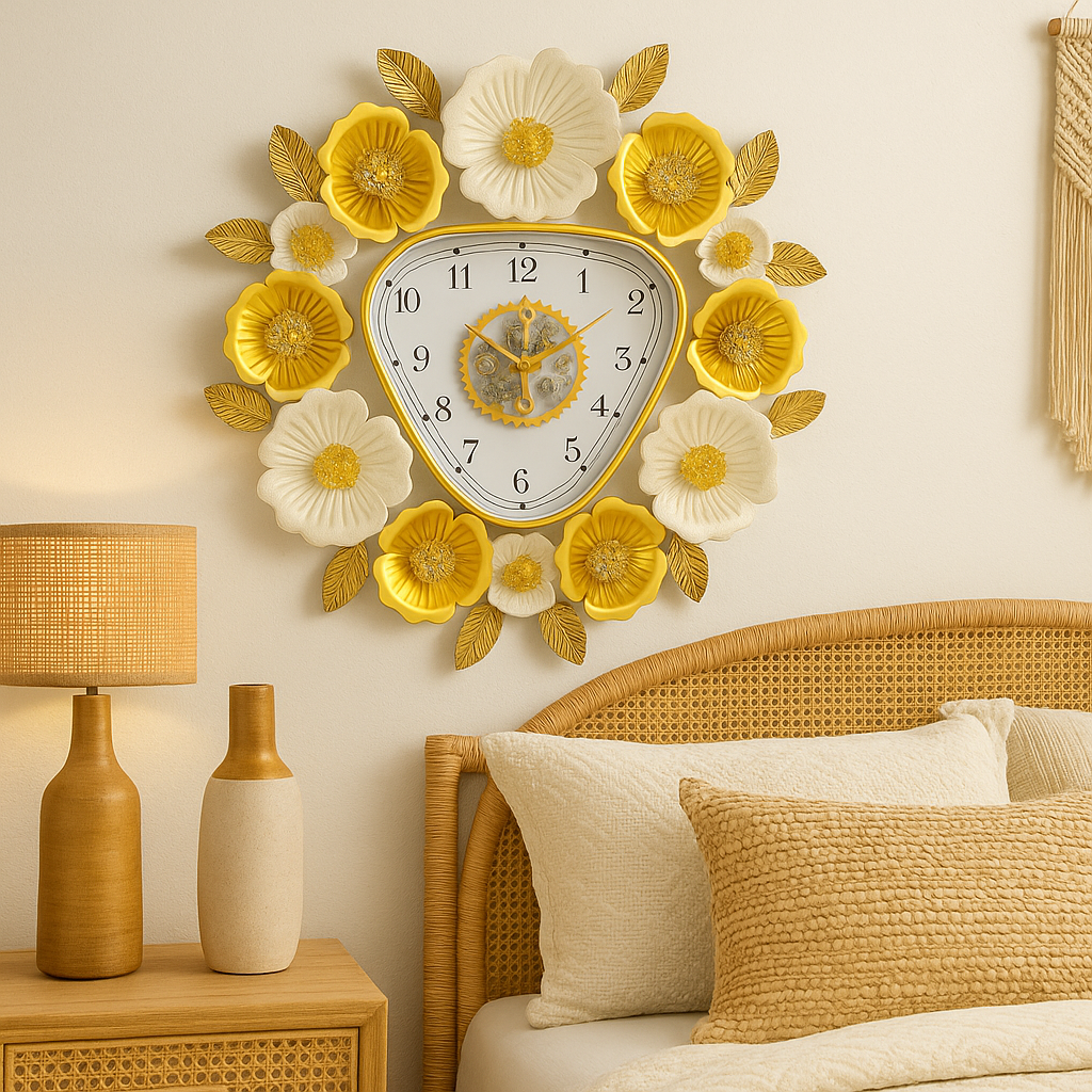 Transform your living space with a timepiece that is also a work of art. This stunning designer wall clock is more than just a way to tell time; it's a captivating statement piece that brings luxury and elegance to any room. The unique design features a modern, rounded-triangle clock face, beautifully framed by an intricate wreath of 3D metal flowers. Finished in sophisticated matte white and lustrous gold, the floral and leaf details create a striking botanical display that adds texture and depth to your wall. At the center, an exposed gear mechanism (non-moving, for aesthetic) adds a touch of industrial chic, creating a perfect balance between soft nature and modern geometry. Crafted from high-quality, durable metal, this large wall clock is built to last. Its quartz movement ensures functionality, making it perfect for bedrooms, home offices, or studies. Whether you're looking to create a stunning focal point in your living room, dining area, or entryway, this gold and white floral clock is the perfect finishing touch for your modern, glam, or contemporary home decor.