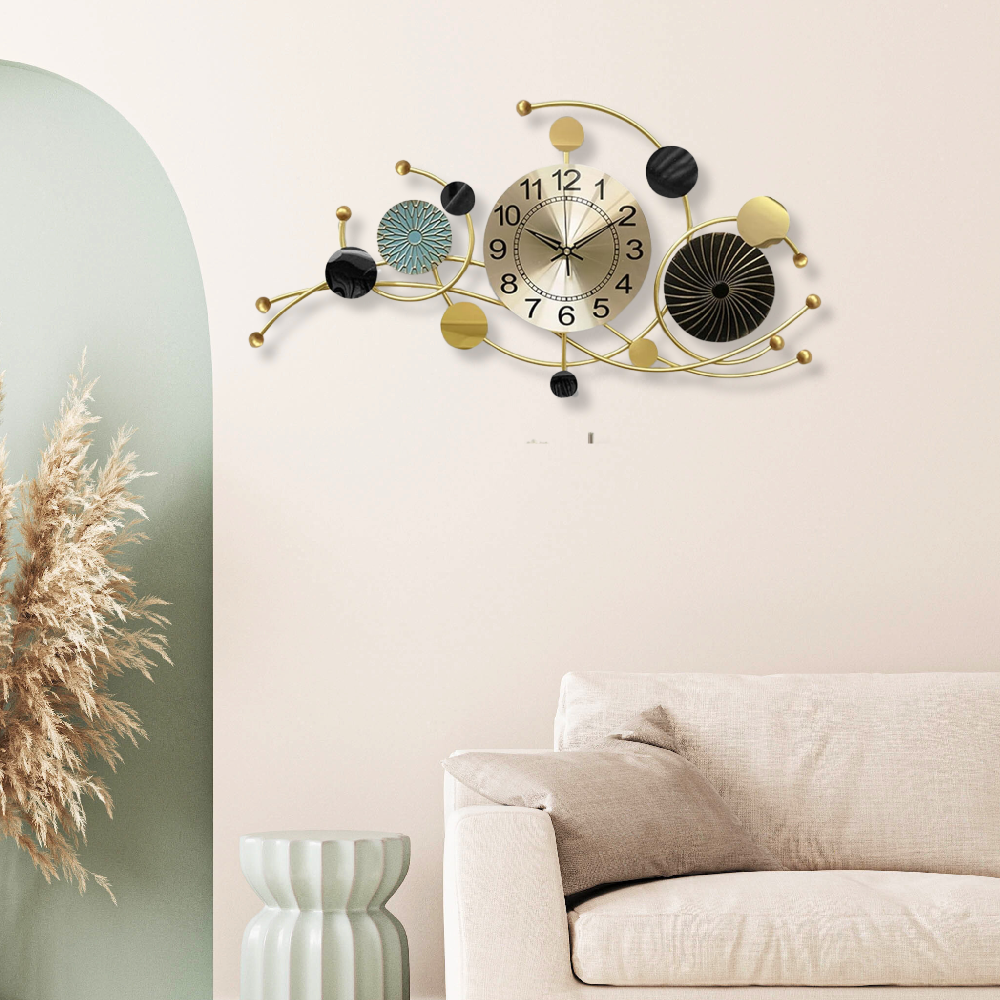 Add bold style to your home with this extra-large 31-inch metal wall clock, a stunning decorative accent for the living room, home office, or bedroom. Showcasing a sleek black and gold abstract design, this oversized analog clock delivers a touch of modern, farmhouse, or industrial charm to any wall. Built for both beauty and practicality, this giant wall clock features a silent, non-ticking movement for a calm, uninterrupted atmosphere. Battery-operated and easy to mount, it’s an ideal housewarming gift or a chic upgrade to elevate your home décor with contemporary elegance.