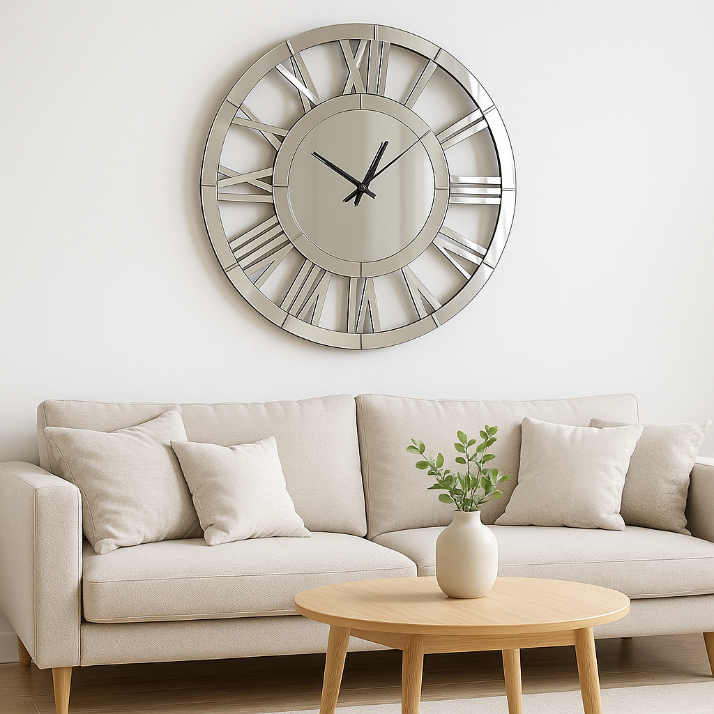 Add a touch of sophistication to your interiors with this luxury 60 cm mirrored wall clock, designed to blend function with timeless elegance. Its vintage Roman numerals, slim metal hands, and silent sweep movement ensure easy readability and a tranquil, tick-free environment. Crafted from premium mirrored glass, this decorative wall clock is built for durability and long-lasting beauty. Whether displayed in a living room, bedroom, or office, its versatile design is ideal for any interior styling - from classic to modern contemporary An ideal choice for a housewarming, wedding, or anniversary gift, this elegant wall clock symbolizes refined taste and comes with professional after-sales support for a seamless shopping experience.