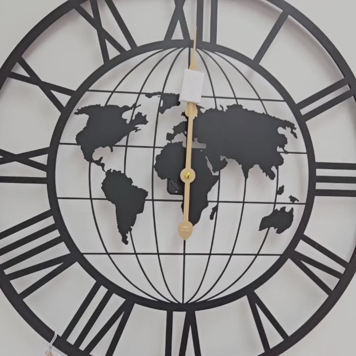 Explore the world anytime of the day right in the comfort of your home with our Black World Map Round Wall Clock. Measuring 24 inch in diameter, this black round wall clock features a meticulously embedded black world map design. The wall art for living room is an ideal above the couch decor. It is also educational, so it's perfect as above the bed decor in your kids room. A silent wall clock, so it won't disrupt sleep with annoying tick tock sounds. The contrasting gold accent clock hands not only complements the minimalist aesthetic but also ensure easy readability of time. Despite being minimalist, this large metal wall clock is eye-catching and unique. Works with a 1AA battery (not included).