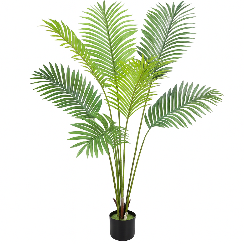 This stunning 5 ft Artificial Areca Palm Tree is designed to bring the beauty of realistic foliage indoors with a nearly natural look and touch. Featuring lifelike leaves and stems, this faux plant is evergreen but with little to no maintenance. The black sturdy base ensures a stable foundation, making it a perfect decorative accent for your home, office, patio, or porch. This artificial areca palm offers a fresh green vibe all year round without any upkeep. NOTE: Spray with UV-resistant spray if placed outdoors to protect the fake plant from extreme heat.