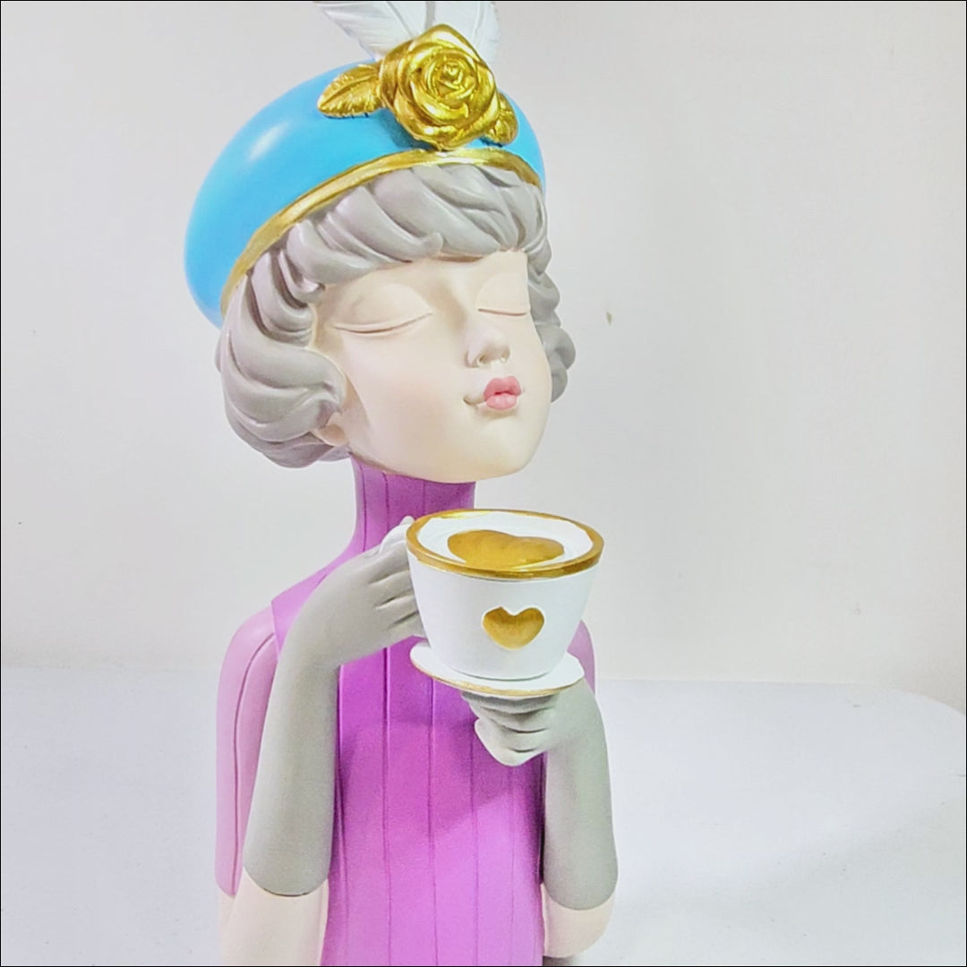 Introducing a charming tea-drinking lady statue that exudes elegance and refinement. This captivating piece features a young woman enjoying a cup of tea, her demure expression both alluring and intriguing. She wears a stylish cap with a feather delicately perched atop her head, adding a touch of sophistication. Perfect for adding a refined, whimsical touch to any space, this statue brings timeless beauty and grace to your home decor. Ideal for collectors and tea lovers alike.