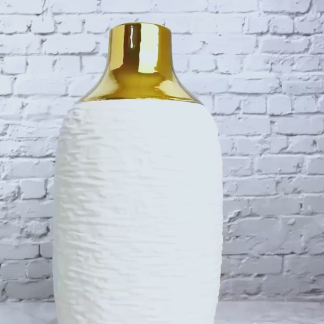 Upgrade your indoor decor with this elegant White Ceramic Vase with a golden rim. Featuring a modern, abstract finish, this versatile vase complements any decor style, from minimalist to farmhouse. Perfect for fresh or faux flowers, it transitions seamlessly from table centerpieces to entryway and mantel decor. Whether used as a bud vase, bouquet vase, or aesthetic accent, it adds sophistication to any setting. Ideal for neutral, modern, or Bohemian decor, this vase makes a stunning statement on console tables, coffee tables, or fireplaces. Embrace its charm as a timeless home decor piece.