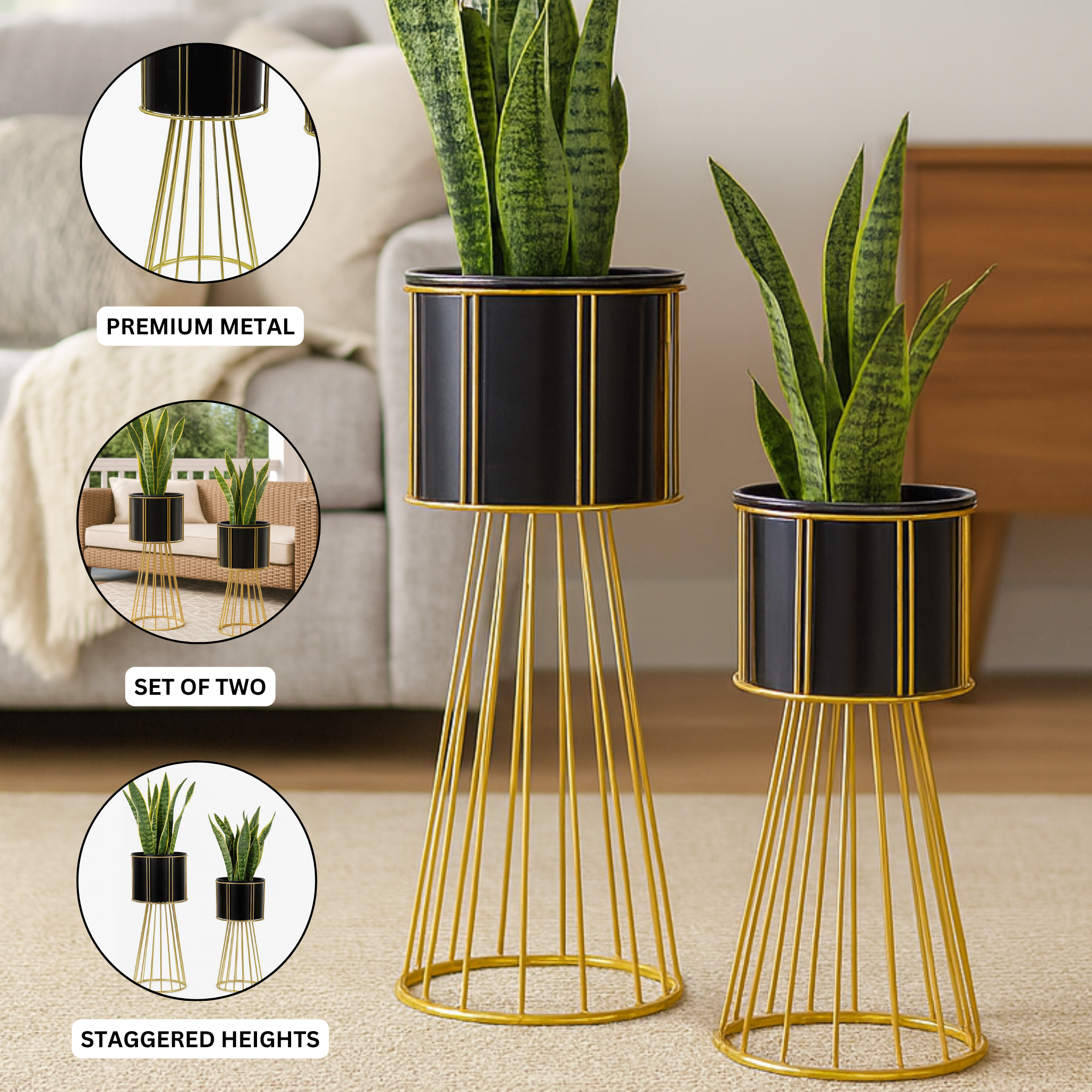 Contemporary Black & Gold Metal Planter Pair, Set of 2 Tall Indoor Plant Stands for Home Decor