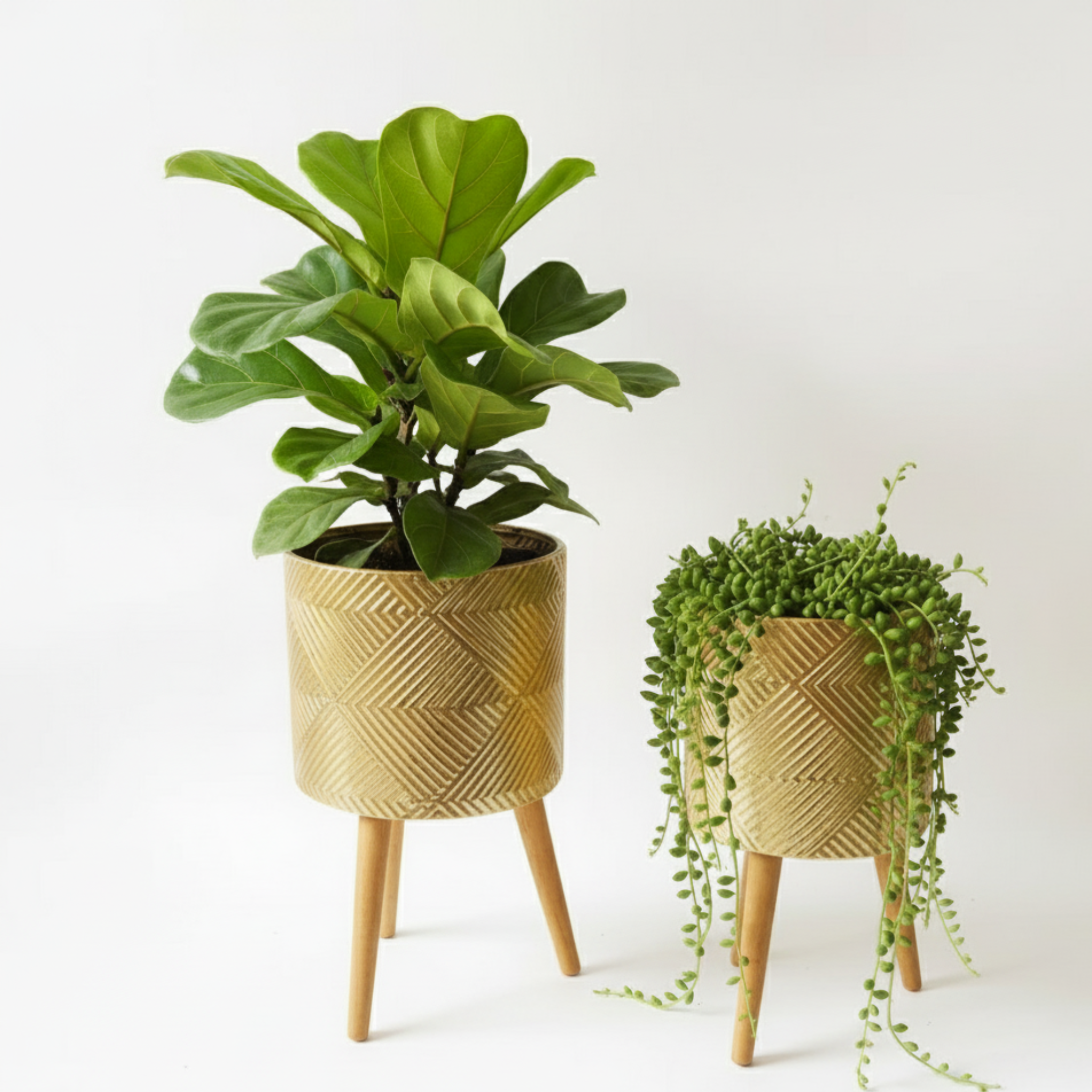 Meet the exquisite Rustic Gold Foil Metal Plant Pots Set with stand. This pair of planters showcases a textured golden rustic foil surface - a truly unique decoration set that's not just stylish but also functional. It's a practical choice for collecting and gifting for all occasions - from Valentine's Day, Mother's Day, to Christmas Day. Each decorative piece is an ideal vessel for your greeneries and blooms - fake or real. Do not underestimate the size of this contemporary set as you can definitely use it for heavy plants with its sturdy and durable metal construction.