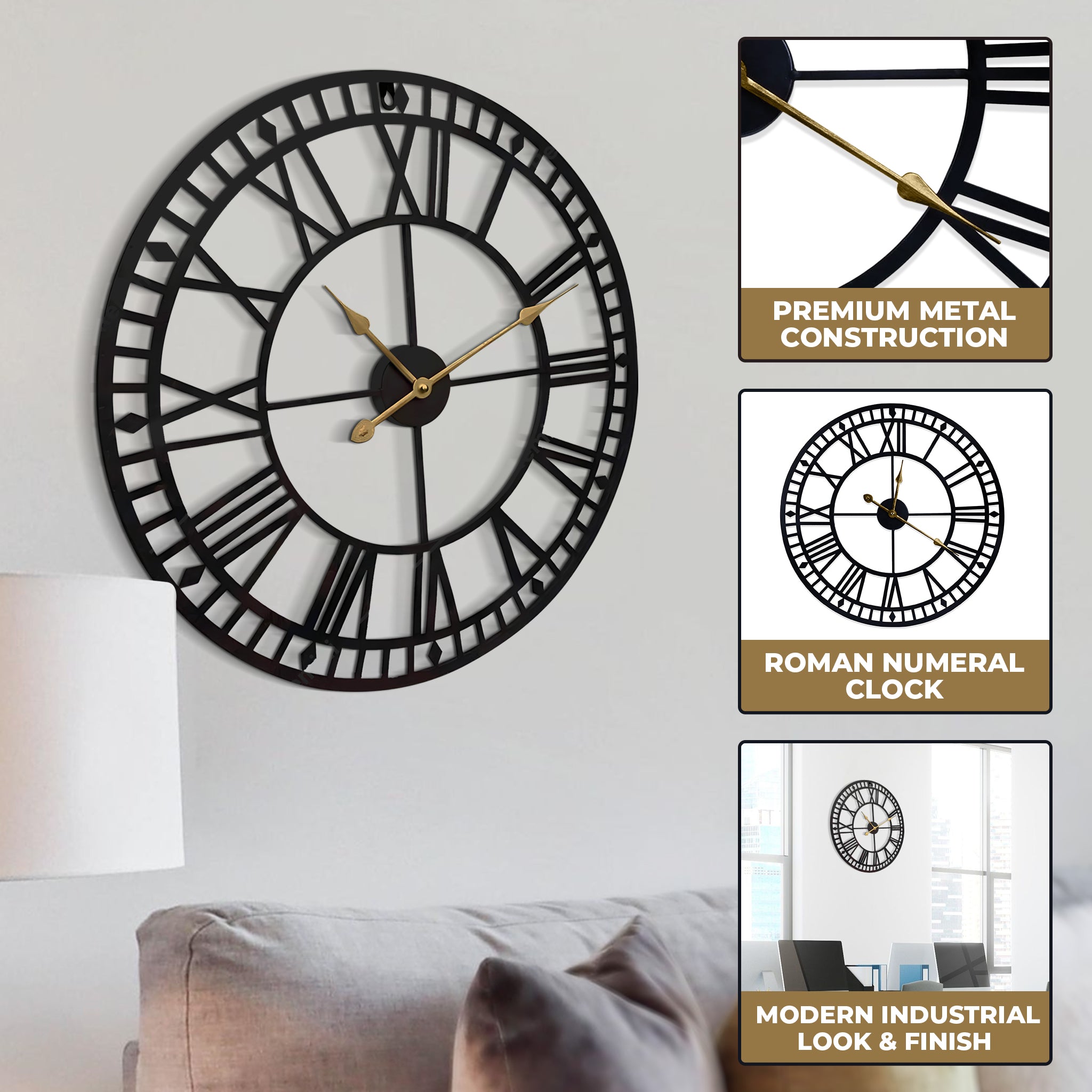 Oversized Round Metal Wall Clock, Large 32" Black Roman Numeral Silent Non Chime Clock, Home Office Decor
