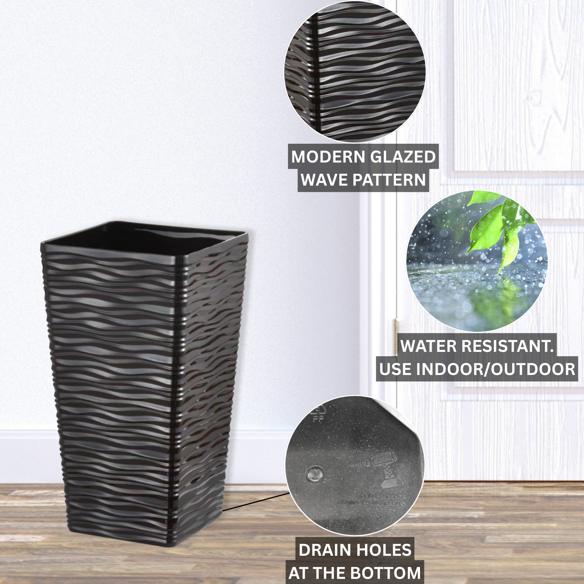 Bring a touch of modern minimalism to your space with this 22-inch Tall Black Planter Pot set, designed for both indoor and outdoor use. Its sleek mid-century style and high-quality plastic construction make this pair of pots a perfect decorative accent for any home, office, patio, front porch, or garden. Whether placed at your entrance, in the backyard, or inside your living room, this versatile flower vase-style plant pot with glazed wave pattern complements all environments while showcasing your favorite real or faux plants. There is a marked space at the bottom of the pot where you can easily drill a hole to prevent overwatering and promote healthy plant growth.